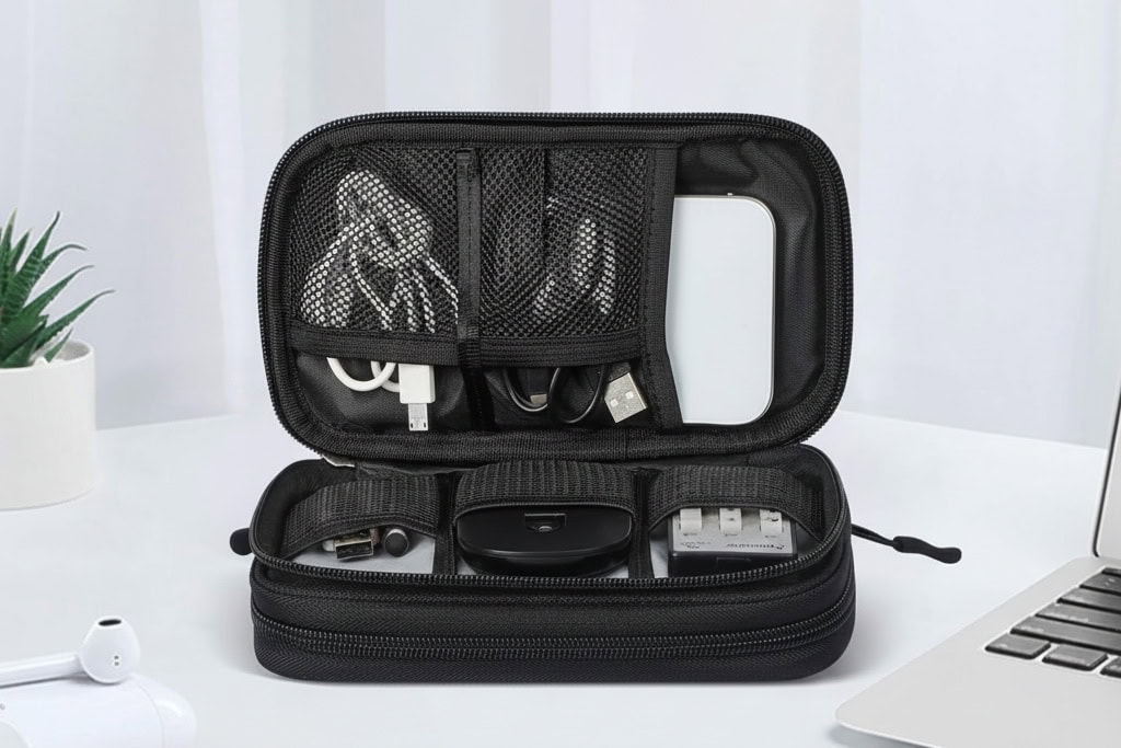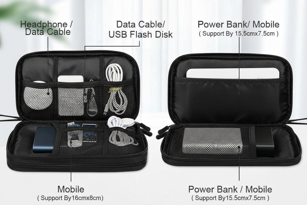 This compact electronics travel organizer is designed to help you store and carry essential accessories such as charging cables, USB drives, earbuds, and power banks in an organized and efficient way. Its versatile layout also makes it suitable for passports, cosmetics, or small stationery items.
