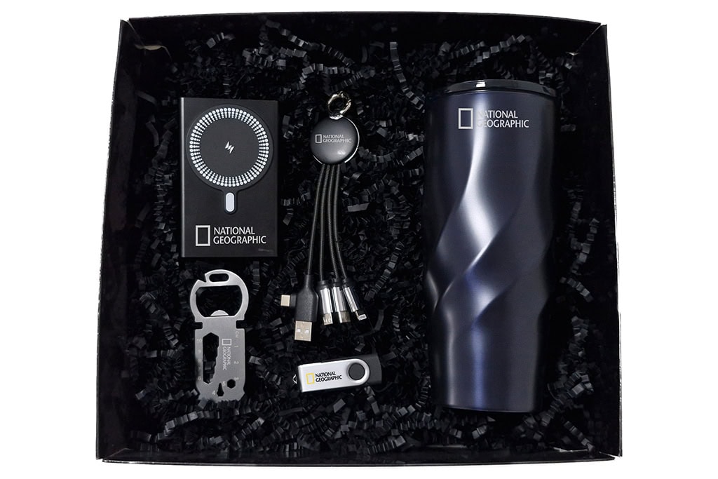 Created for Teacher Appreciation Day, this set features a tumbler, power bank, charging cable, USB flash drive, and multifunctional keychain. The products are presented in a gift box filled with zigzag paper, which protects the items and adds an elegant finishing touch. The filler color can be customized to match your branding. All products and the box lid can be branded with your company logo, making it a thoughtful and personalized gift.