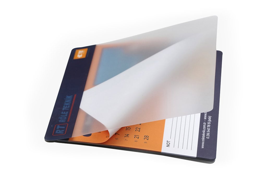 The bottom layer, made from Nova (flat) or textured rubber, ensures the printed mouse pad stays firmly in place on the desk. This special surface offers both durability and comfort. The PVC cover protects the calendar pages and maintains its form even after long-term use.