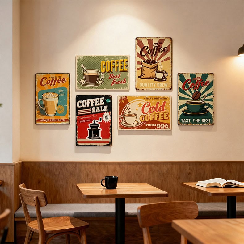 These Custom Vintage Metal Tin Signs are durable decorative products crafted by applying high-resolution visuals onto premium tinplate sheets. They are designed to create visual depth and a nostalgic touch in various environments such as homes, offices, cafes, restaurants, bars, garages, and barbershops. Combining traditional advertising signage logic with modern production standards, these signs offer an authentic look and feel while adding a characteristic atmosphere to any space. Designed as long-lasting Retro Metal Posters or unique design objects, they can be applied directly to wall surfaces to transform the essence of your environment.