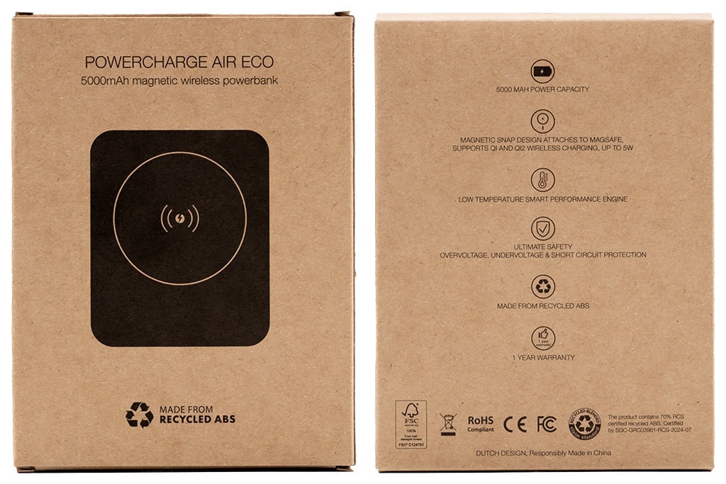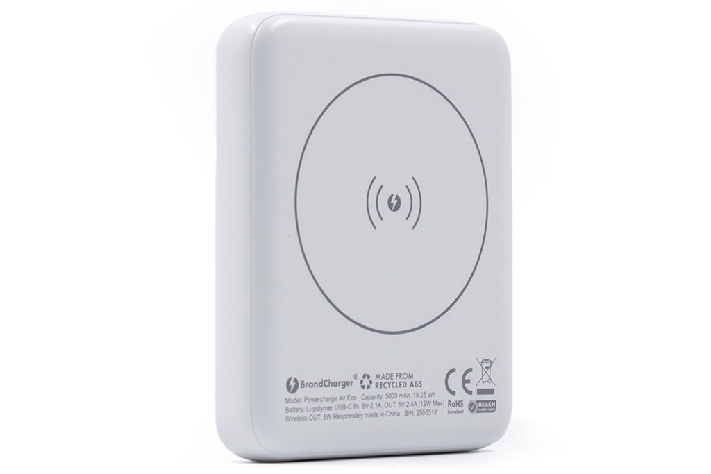 The Powercharge Powercharge Air Eco by BrandCharger is a standout in the new generation of promotional tech. Made with recycled ABS plastic, this compact wireless power bank promotes your brand while supporting sustainability.
